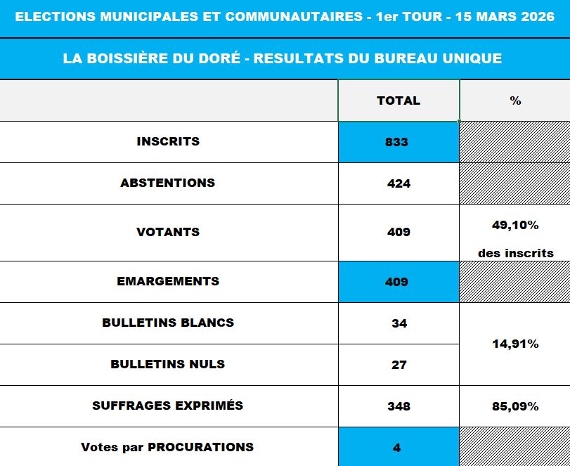 Ci-dessous les résultats de l’unique liste “Avançons ensemble pour La Boissière du Doré” conduite par Catherine GARCIA SENOTIER :